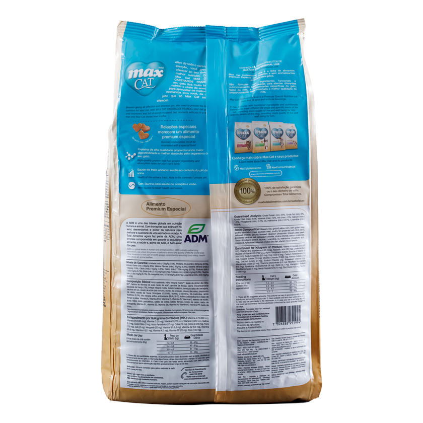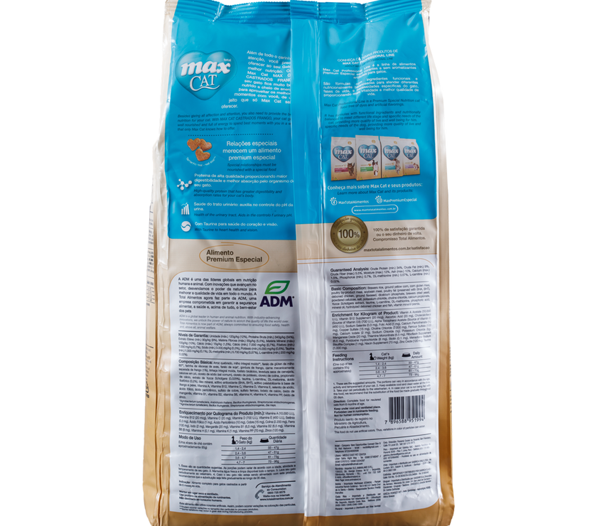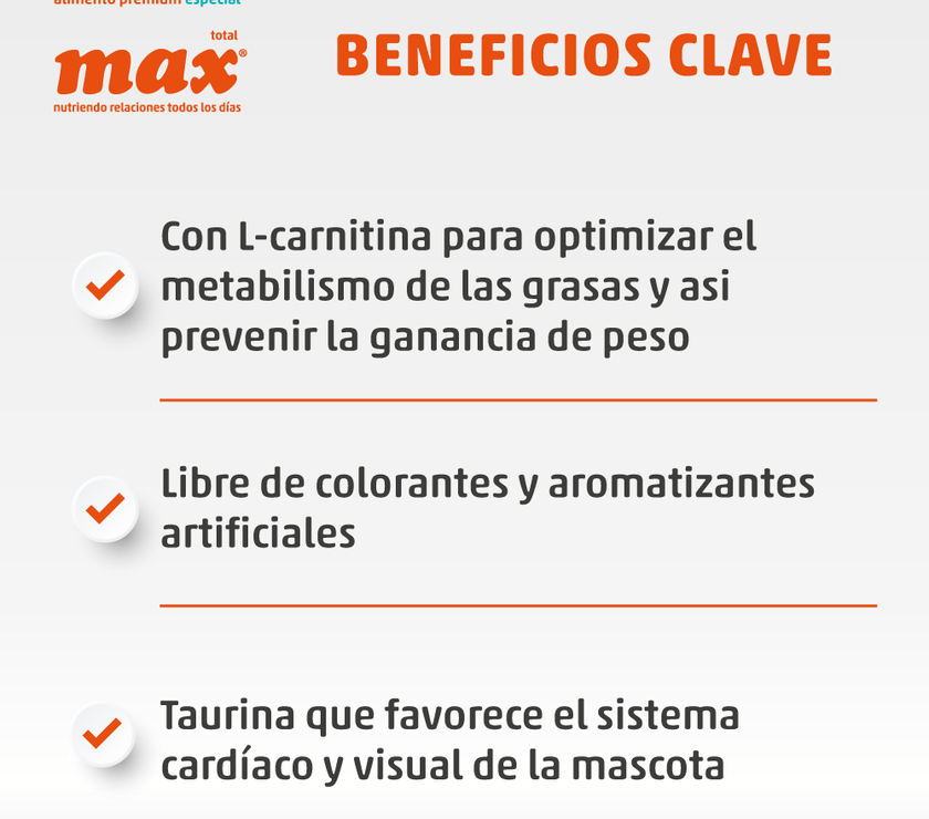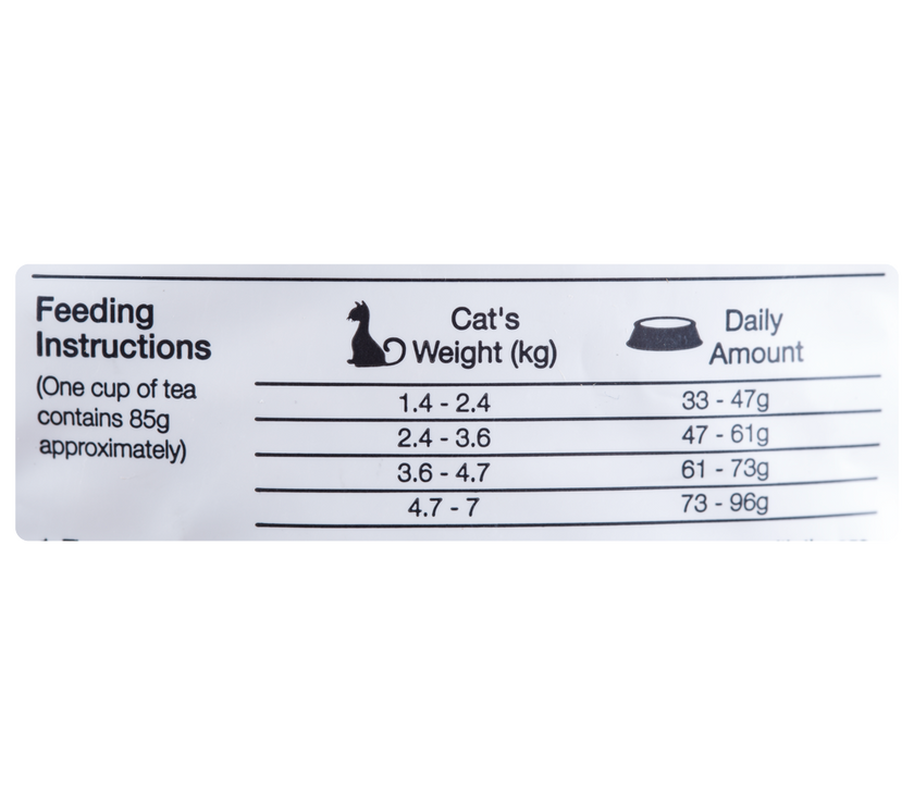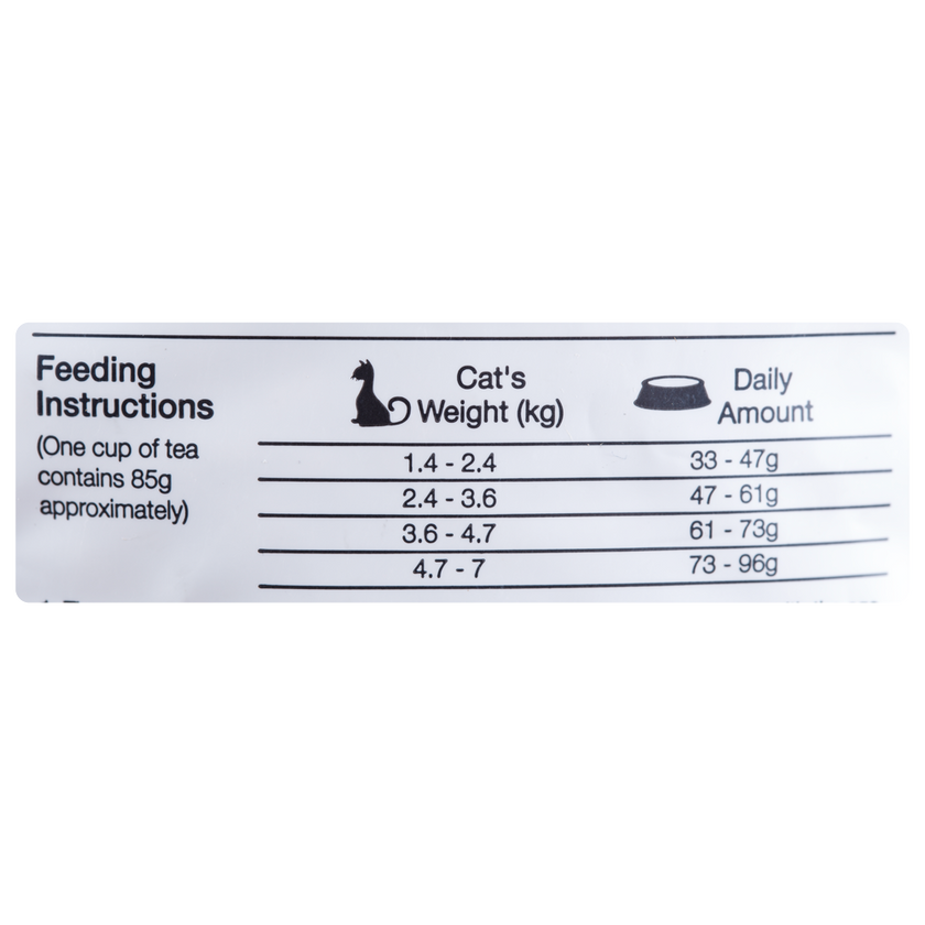 Arroz medio grano, Maíz integral molido, Afrecho de gluten de maíz 60, Harina de menudos de pollo, Afrecho de soja, Grasa de pollo, Carne mecánicamente separada de pollo, Semilla de linaza, Fosfato dicálcico, Levadura seca de cervecería, Celulosa en polvo, Cloruro de sodio (sal común), Cloruro de potasio, Cloruro de colina, Propionato de calcio, Extracto de Yucca schidigera, Taurina, L-carnitina ,DL-metionina, Ácido fosfórico, Aceite mineral, Aditivo antioxidante (BHA, BHT), Hidrolizado de pollo y pescado, Suplemento mineral vitamínico