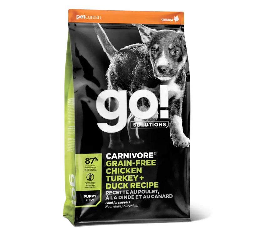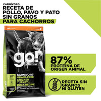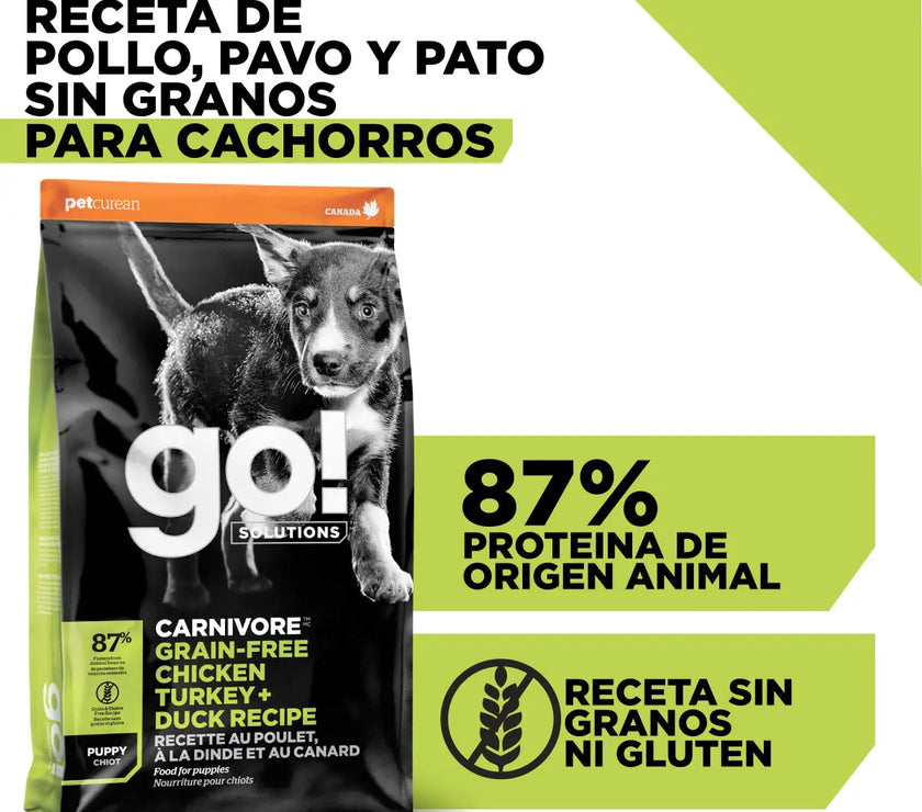 Esta receta para cachorros GO! CARNIVORE sin granos tiene deliciosas proteínas de origen animal como pollo, pavo, trucha, pato y salmón de primera calidad que ayudan al crecimiento y desarrollo de músculos fuertes. Además, contiene DHA y EPA para potenciar el desarrollo cognitivo y la salud de la visión.