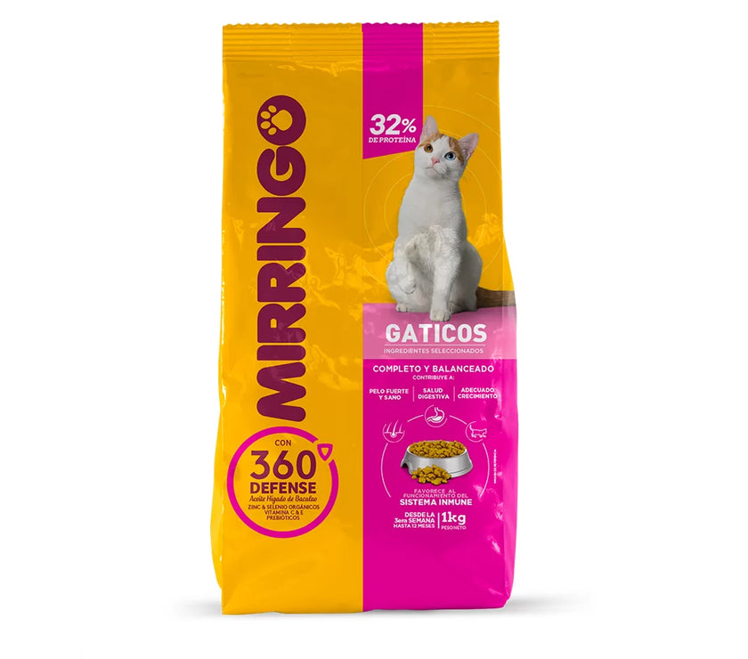 Mirringo Gaticos 360 Defense con aceite de hígado de bacalao, es un alimento completo y balanceado diseñado para satisfacer todos los requerimientos nutricionales para el crecimiento y fortalecimiento del sistema inmune de tu gatico.